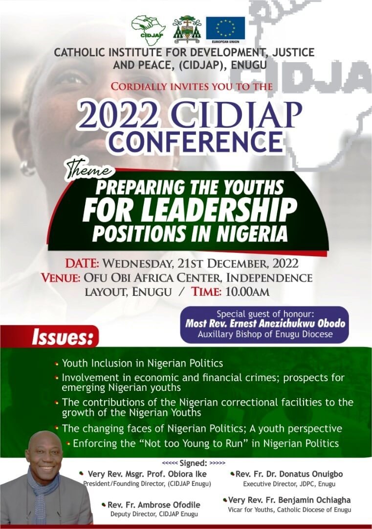 Theme: “Preparing the Youths for Leadership Positions in Nigeria” holding on Wednesday, 21st December 2022 at Ofu Obi Africa Center, Independence Layout, Enugu. Time: 10am.